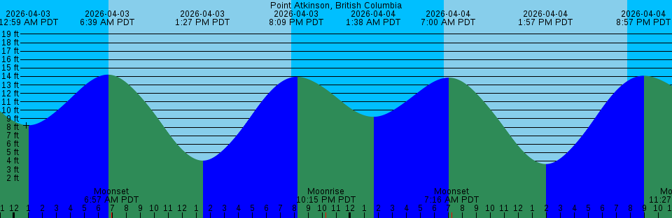 | 2026-04-03 | 12:59 AM 8.23 ft | 6:39 AM 14.22 ft | 1:27 PM 4.05 ft | 8:09 PM 13.96 ft | |